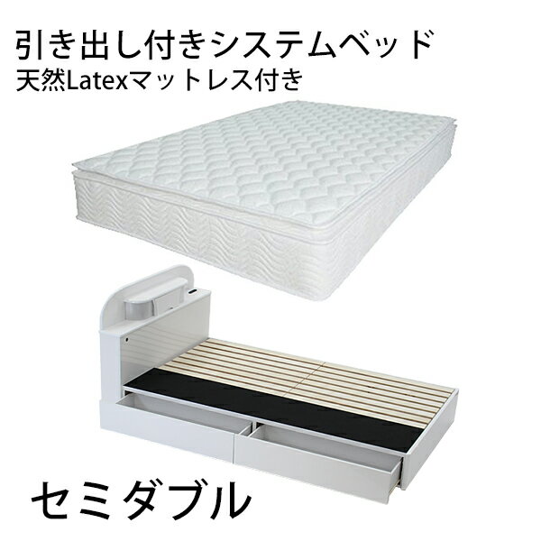 送料無料 新品 引き出し付きシステムベッド ラテックスマットレス付き セミダブル 白 ホワイト ライト付き ベッドフレーム ロータイプベッド システムベッド すのこ ベッド フレーム 木製 引き出し 照明 LED コンセント 収納 収納ベッド 多機能 桐 lis03sdwhlat